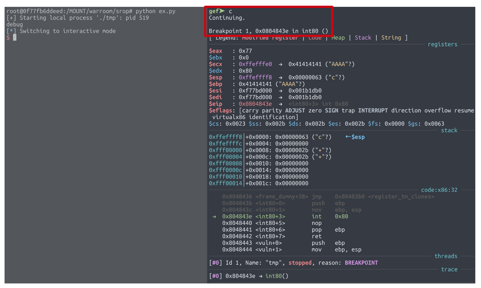 6. 오른쪽 터미널에서, 브레이크를 설정한 0x0804843e에 멈춘 것을 볼 수 있음