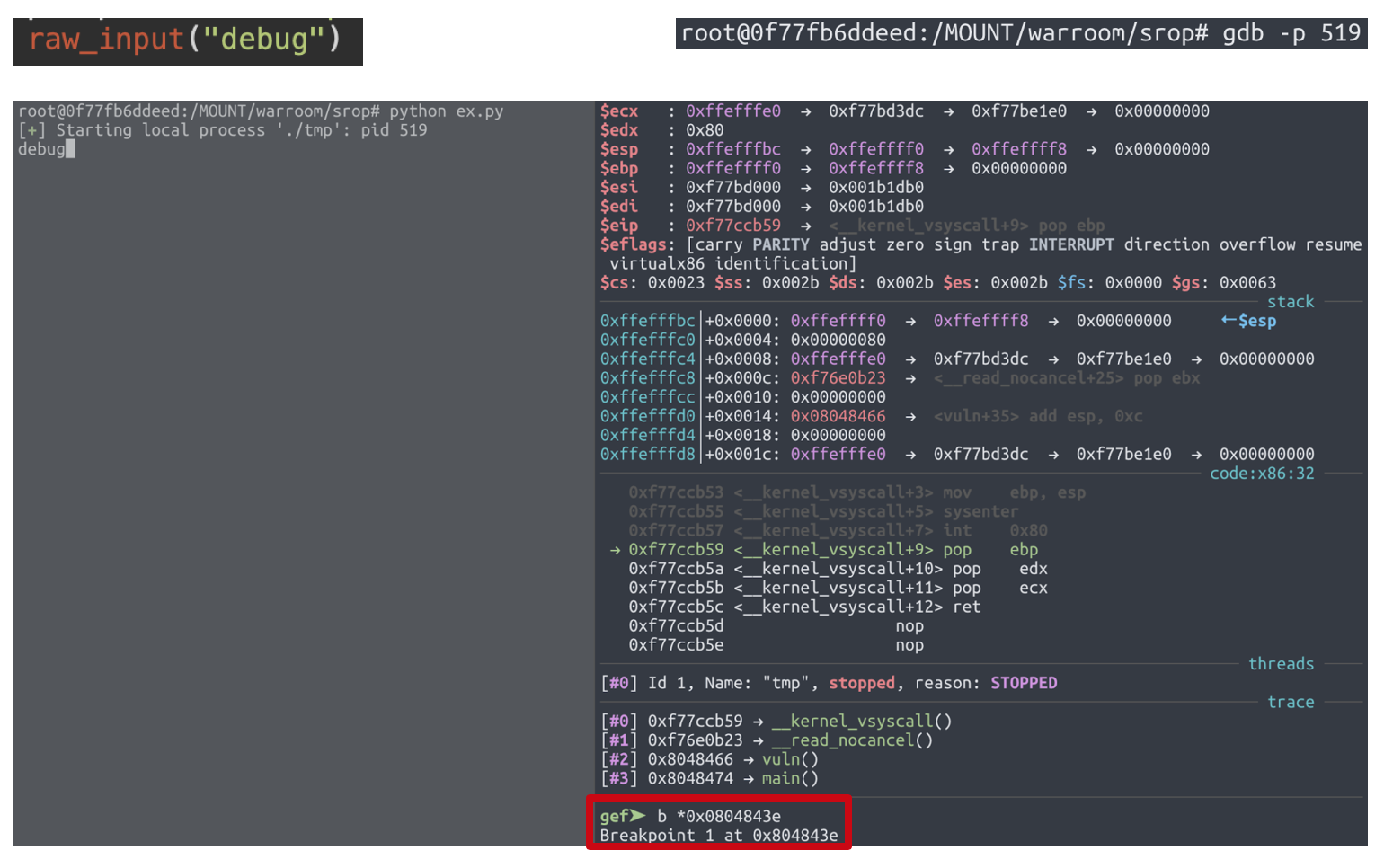 1. 먼저 exploit 코드 중간에 raw_input()을 추가하고, 왼쪽 터미널에서 보이는 것과 같이 ex.py를 실행한다.