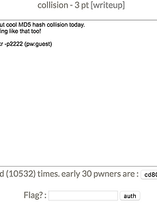 Collision1 pwnable.kr collision Pwnable.kr# [Toddler’s Bottle] collision collision 문제를 보면 아래와 같은 화면을 볼 수 있다. col.c 파일은 아래와 같다. system(“/bin/cat flag”) 가 수행되도록 하면 된다.이 때 hashcode와 check_password( argv[1] )의 값이 같아야한다. check_password()를 보면 입력받은 20바이트를 char형 포인터로 받아 4바이트 씩 나누어 다섯 개를 더한 뒤 리턴한다. 즉 더했을 때 hashcode가 나오는 다섯 개의 수를 알면 된다.따라서 python을 이용하여 해당 수를 5로 나눈 뒤 적절히 맞추어 주었다. 그 결과 flag를 얻을 수 있었다. 2019. 2. 1. 이전 1 다음