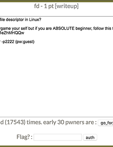 File Descriptor1 pwnable.kr fd [Toddler's Bottle] fd fd 문제는 아래와 같다. 문제 이름처럼 file descriptor에 관한 문제라고 한다. 일단 접속을 해보면 위와 같이 fd.c 가 있는 것을 보게 된다. fd.c 코드를 보면,fd에 argv[1]을 int로 변환한 값에서 0x1234를 뺀 값을 저장한다.그 뒤, buf에 32바이트만큼 읽어오고 “LETMEWIN\n”과 비교한다. 따라서 fd를 stdin으로 해준 뒤, 해당 문자열을 입력하면 될 것으로 보인다.stdin은 0에 해당하므로 0x1234, 즉 4660을 입력한 뒤 stdin으로 LETMEWIN을 입력하니 flag를 얻을 수 있었다. 2019. 2. 1. 이전 1 다음