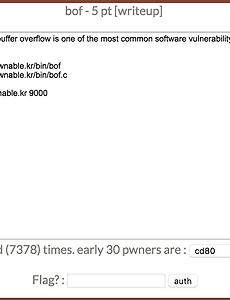 buffer overflow1 pwnable.kr bof [Toddler's Bottle] bof bof문제는 아래와 같다. 아래는 bof.c 코드이다. overflowme를 이용하여 func의 인자로 전달되는 key를 0xcafebabe로 덮으면 될 것으로 보인다. 이 때 overflowme와 key의 거리를 알아야 하므로 AAAA를 입력했을 때의 스택 상태를 보면0x41414141이 0xffffd37c에 위치해 있고0xdeadbeef가 0xffffd3b0에 있는 것을 알 수 있다. 0xffffd3b0 - 0xffffd37c = 0x34 = 52이므로52만큼 A로 덮은 뒤0xcafebabe를 넣어주면 된다. 코드는 아래와 같다. 그 결과 flag를 얻을 수 있었다. 2019. 2. 1. 이전 1 다음
